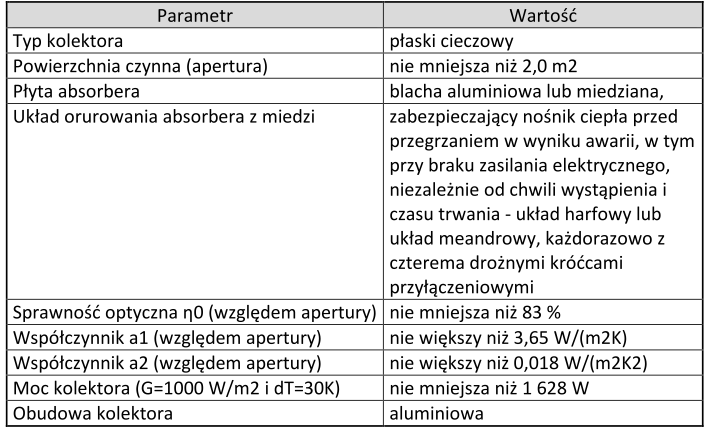 W ramach projektu instalowane będą kolektory płaskie z wysokoselektywnym pokryciem absorbera. Montowane będą za pomocą odpowiednich uchwytów dachowych lub ściennych. Przyjęto założenie, że będą one pokrywać zapotrzebowanie na c.w.u. w ok. 50% w skali roku. Podstawowe parametry kolektorów przedstawiono w poniższej tabeli.